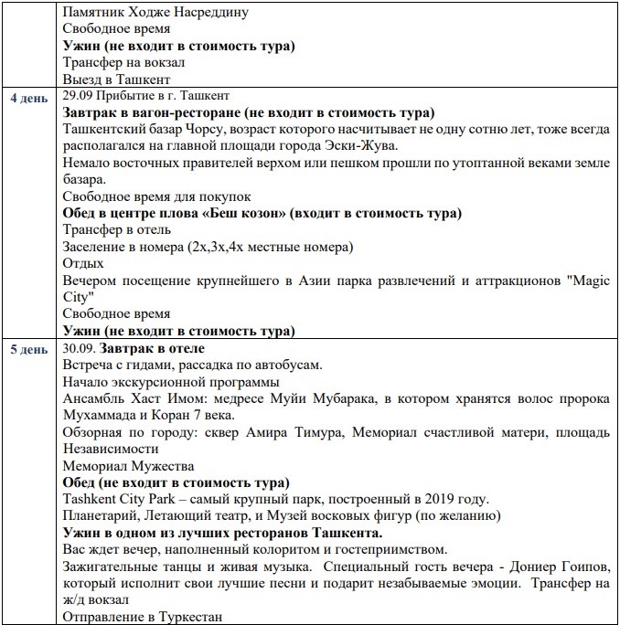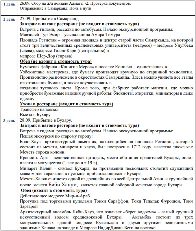 Экскурсионный тур на поезде через Самарканд, Бухару, Ташкент и Туркестан позволяет с комфортом проехаться по очень красивым и интересным местам. Экскурсия начинается и завершается в Алматы. Рассмотрим подробнее посещаемые достопримечательности. Туран Экспресс тур, +7 701 318 89 34
