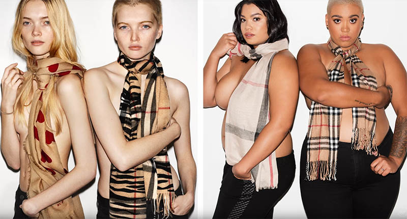 Реклама Burberry выглядела так: две модели, одетых только в джинсы и фирменные шарфики стоят лицом к камере. Обе худые, светлокожие, одна из них очень коротко стрижена. Из-за стрижки одна из девушек «плюс сайз» - Джазмин - вызвалась копировать эту кампанию. Шеридан составила ей пару. Джазмин и Шеридан - темнокожие, так что должен был получиться своеобразный негатив известного рекламного снимка. Девушки весьма нервничали: еще бы, первая профессиональная фотосессия и сразу топлес! Джазмин: «По правде говоря, мы обе достаточно грудастые, а шарфы вообще-то нужны, чтобы сохранять тепло, а не чтобы прикрывать бюст». Шеридан: «Нужно принимать выгодные позы, чтобы большая грудь хорошо смотрелась, и не провисала».