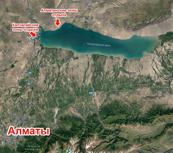 Капчагай находится на реке Или примерно в 76 км от Алматы. В 2017 году по направлению к водохранилищу проложена 6-полосная бетонка, обеспечивающая возможность быстро добраться до расположенных здесь зон отдыха.