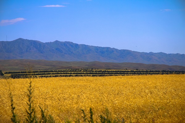 Сары-Озек, или, по-нашему Желтая Спина, название свое получил неспроста: среди скал преобладает какой-то оттенок выцветшей охры, плюс колосящиеся поля с пшеницей, и над всем этим бескрайнее голубое небо.