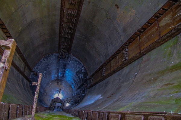 Несмотря на сохранившийся металлический балкончик вокруг шахты, фотографировать вертикальный ствол вниз страшновато и напряжно. Я очень боюсь высоты, гулкое гигантское помещение под многотонным бетонным колпаком шахты резонирует от хлопанья птичьих крыльев, ведь там полно голубей, а распалившееся воображение рисует мне ужасающую картину того, как с протяжным скрежетом прогнившие мостки отделяются от стены стакана, увлекая меня вниз, в темную густую жижу. Пернатых жителей много и здесь, они гнездятся на балках, в многочисленных люках и технологических отверстиях, повсюду кучи их помёта, перьев и даже целых трупиков. Брезгливым людям, боящимся замараться о птичье гуано, не место в таких местах.