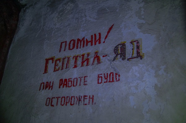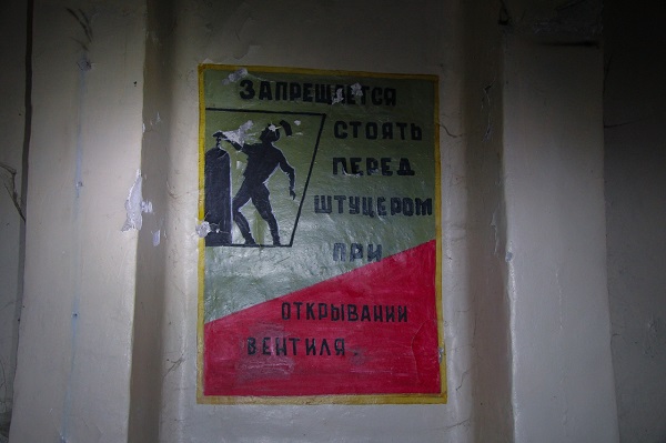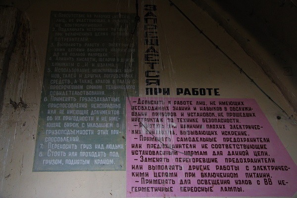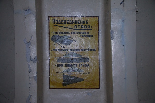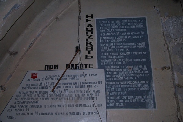 Смотреть тут особенно было не на что, и я перешел к ангару для регламентных работ. Когда-то он был разделен кирпичными перегородками на много отсеков, но сейчас их все снесли, а кирпичи убрали и расчистили, о былом количестве комнат напоминают только стены и потолок, покрашенные в разные цвета на разной высоте. Посреди ангара осталась торчать одна массивная бетонная опора, которую, видимо, поленились ломать. Самой интересной фишкой этого сооружение было наличие сохранившихся надписей, повествующих о том, как правильно обслуживать ракету, грузить ее и эксплуатировать. Сфоткал наиболее интересные и полные надписи, может когда-нибудь для истории пригодятся: