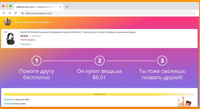 Групповая акция «Сруби цену до нуля» тоже доступна только в приложении. AliExpress действует следующим образом: вы выбираете товар, участвующий в этой акции, получаете ссылку и делитесь ей с друзьями. Они должны будут перейти по ней и нажать на кнопку «сбить цену», таким образом, позволив вам сэкономить на покупке и получив для себя скидочные купоны на будущие покупки.