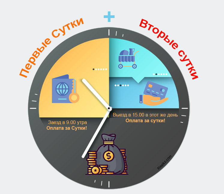 Например, гость заселится в номер в 9 утра, то время, оставшееся до 12 часов дня, будет считаться сутками. Точно так же и с выездом - выедет из номера в 15.00 (в этот же день), заплатит за 2 сутки.