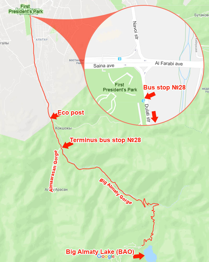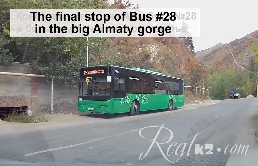 Bus route number 28 begins its journey from Navoi Street, near the Park of the First President and will take you to the final stop - Big Almaty gorge. This type of transport is beneficial due to the fact that they are allowed to pass at the eco-post without stopping and do not require an environmental tax from passengers.