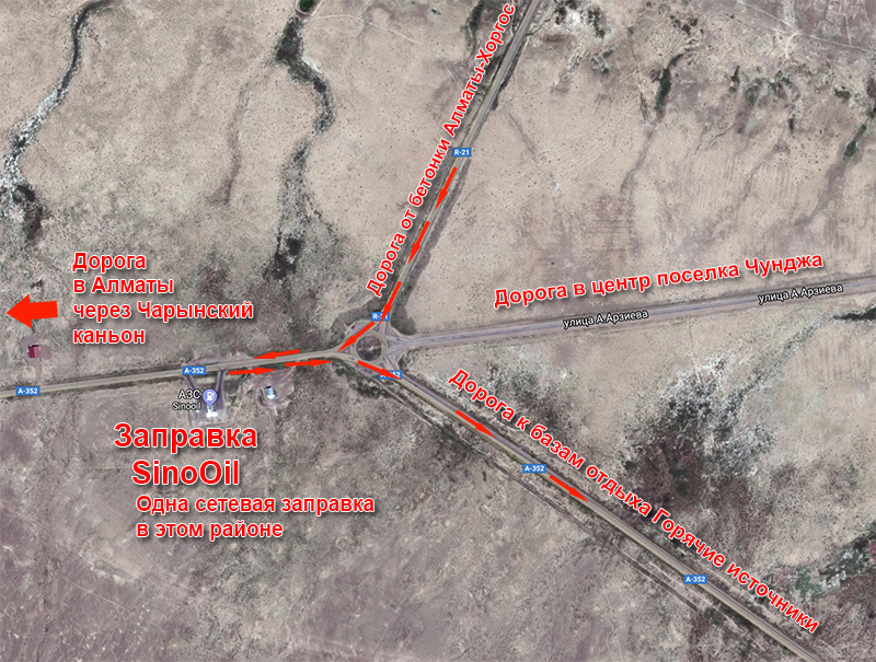 В сам поселок Чунджа заезжать не нужно. Следует повернуть перед ним направо на объездную дорогу. Там же можно дозаправиться на Sinooil — единственной приличной заправке. На ней имеются все марки бензина, магазин и туалет.