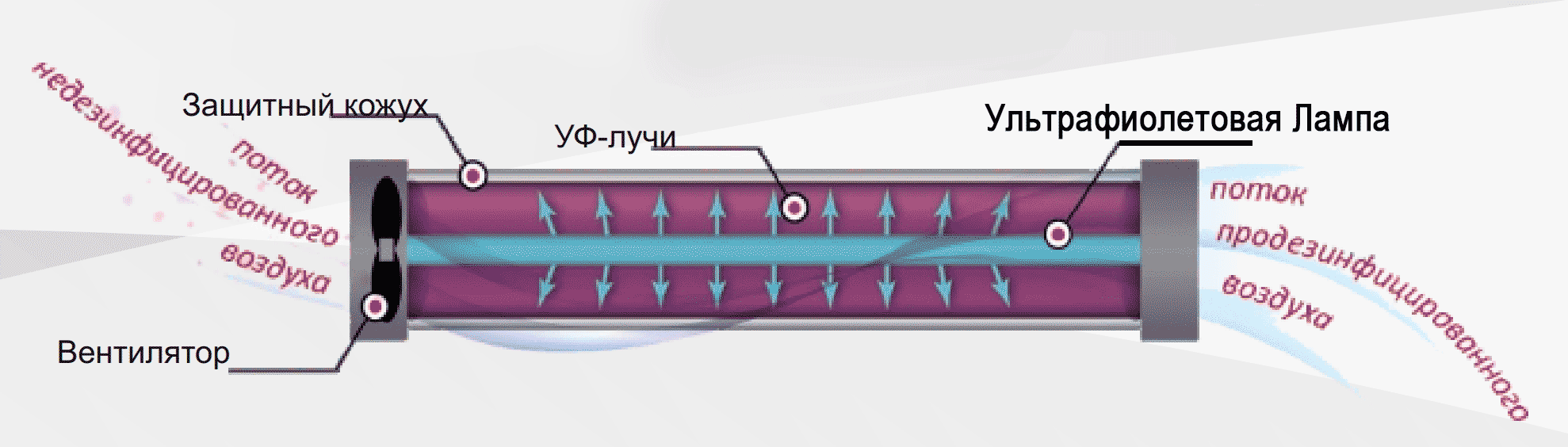 Рециркулятор представляет собой корпус, в который вентиляторами затягивается воздух из помещения. Воздух проходит обработку ультрафиолетом, который исходит от лампы. Этот свет разрушает болезнетворные микроорганизмы на молекулярном уровне. Через верхнее отверстие очищенный воздух выходит обратно.