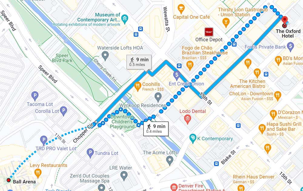 Located only 0.8 miles (1.3 km) away from Ball Arena, you can get there by foot in about 15 minutes.