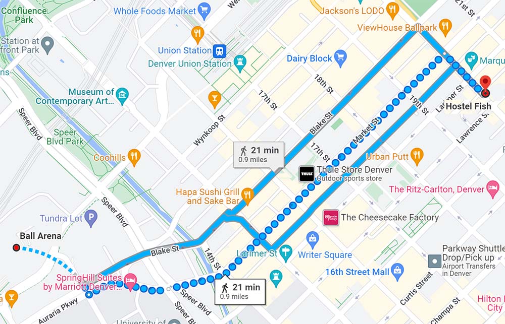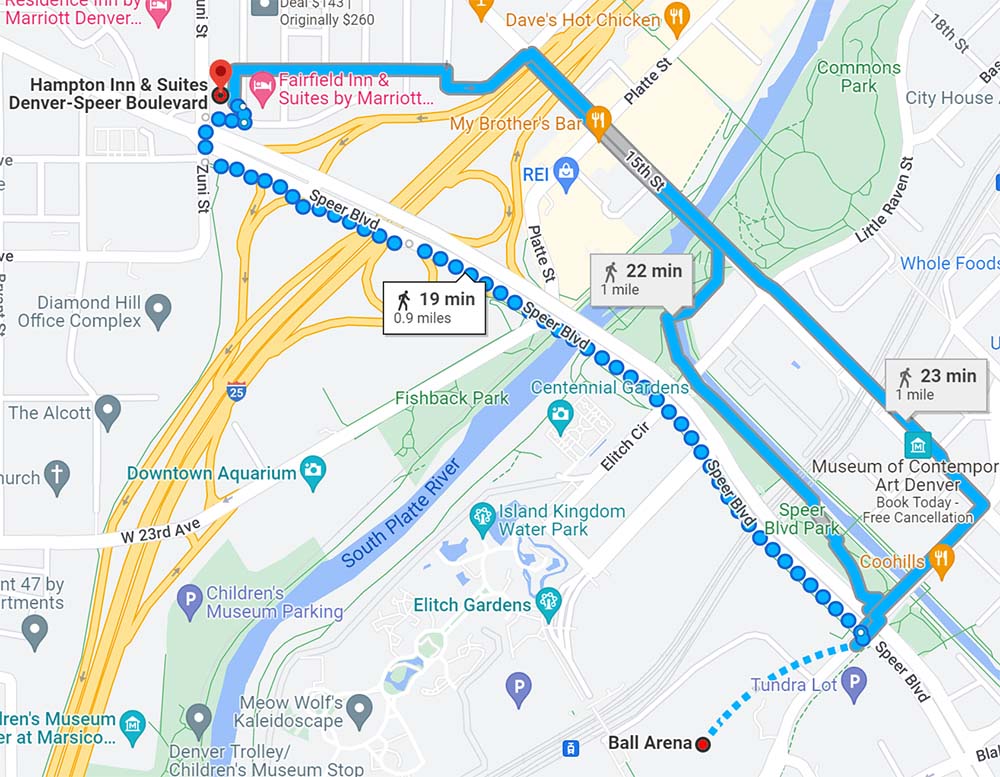 Located only 1 mile away from Ball Arena, you can get there by foot in about 25 minutes.