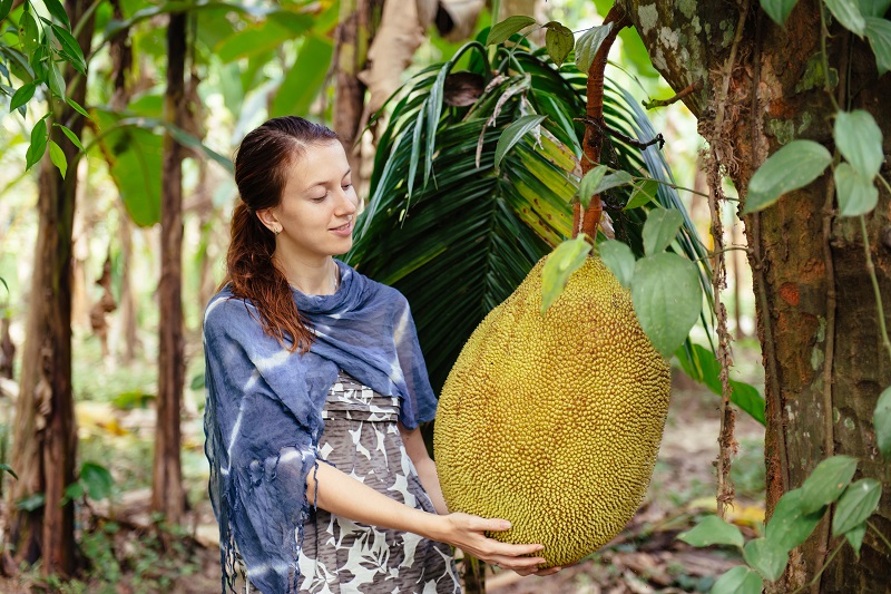Экзотический фрукт отдаленно похож по вкусу на грушу дюшес. Можно есть сырым или после обработки (варенье, джем). Вес зачастую достигает 40 кг. 80% – это съедобная мякоть. Зрелые и незрелые плоды джекфрукта – часть национальной кухни в Азии.
