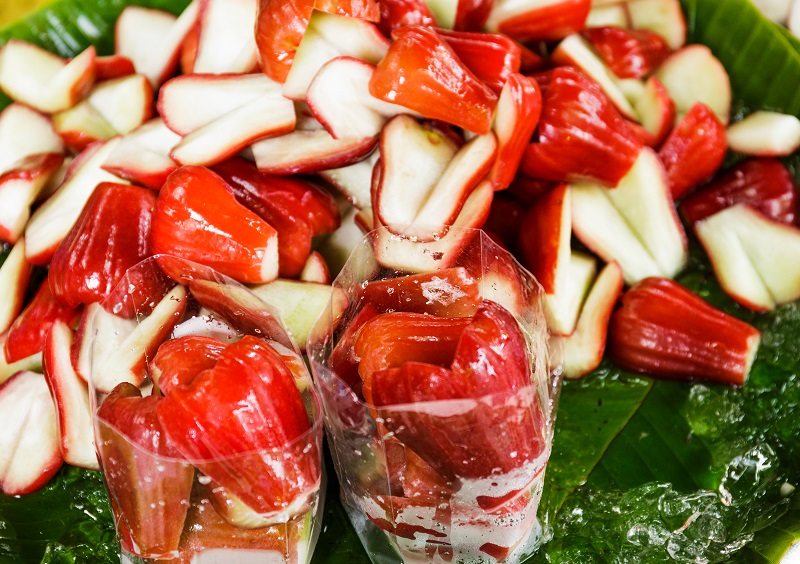 Встречаются светло-зеленые и розоватые чомпу. Внутри находится сочная белая мякоть. Выраженного оттенка нет. Часто чомпу называют «сладкой водой». Chompoo ярко-красного цвета, а по внешнему виду напоминает красный перец.
