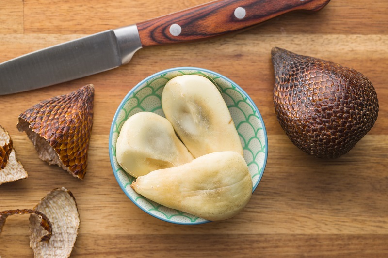 Внешний напоминает что-то среднее между шишкой, авокадо и киви. Плоды сала растут гроздьями и свисают так же, как виноград. Вкусовые особенности – смесь винограда, абрикосов, персиков, ананаса и клубники. Часто в отзывах отмечают «парфюмерный» оттенок тропического фрукта: словно бы внутрь брызнули духи. Незрелые плоды могут «вязать», т.к. содержат танины.
