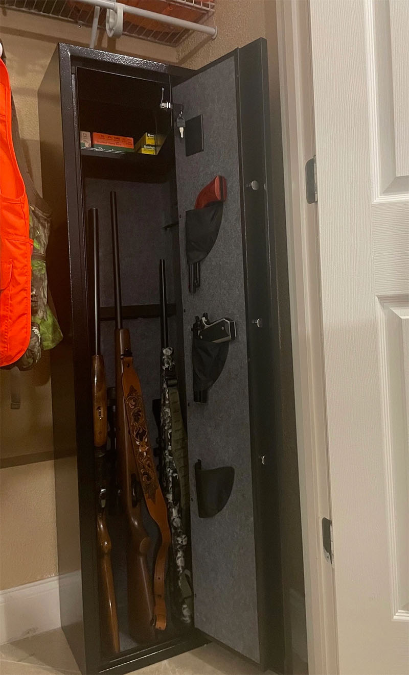 "Upon arrival, the safe was well-packaged and in good condition. It offers a removable top shelf and extra storage space on the door. Functioned flawlessly straight out of the box. The size suits my needs perfectly, and in this price range, it stands out as the best gun safe or cabinet. It boasts large locking pins, a heavy door, and an alarm system. My primary use is to secure my firearms from the curious hands of children. Moreover, it serves as a deterrent to casual intruders. With this safe, my weapons are now securely stored instead of just standing against the wall." — Jason Hughes