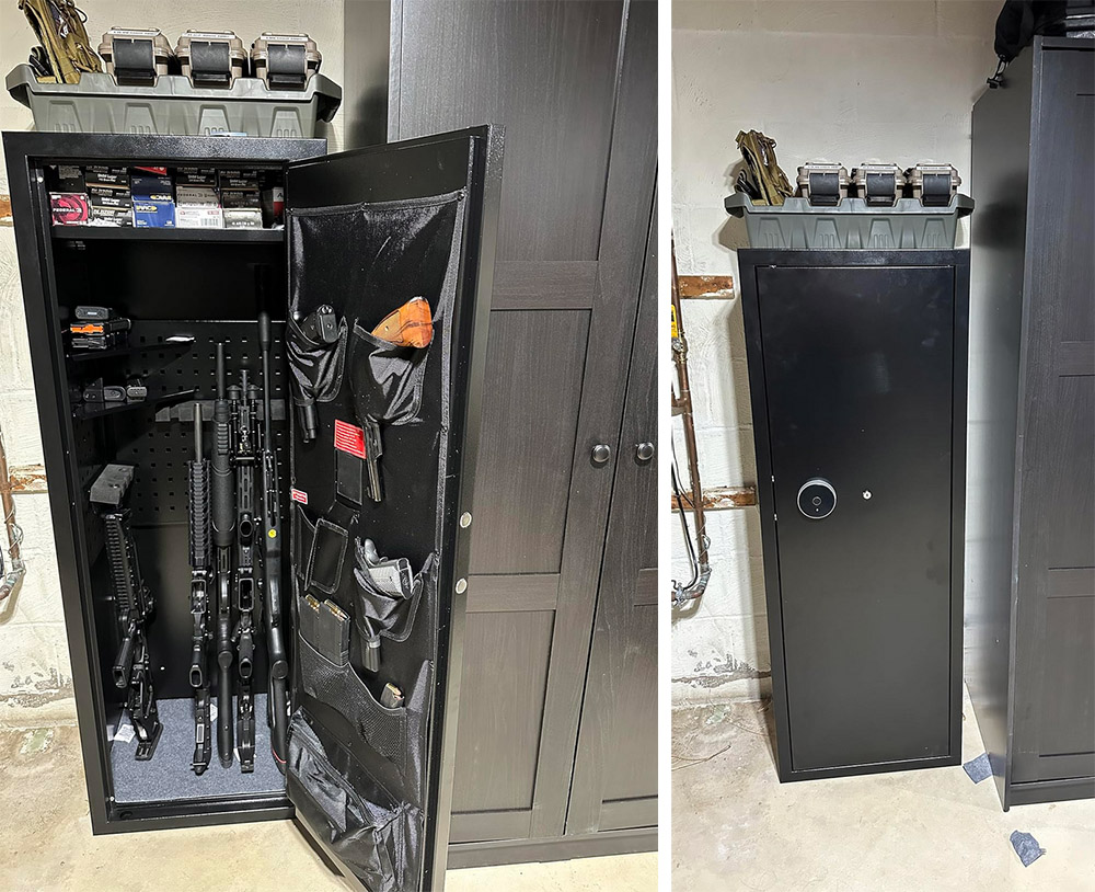 Inside, it accommodated my rifles, pistols, and ammo with adjustable shelves. The pistol holder on the door was a nice touch.