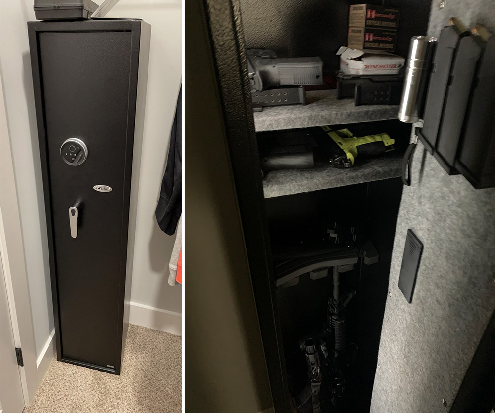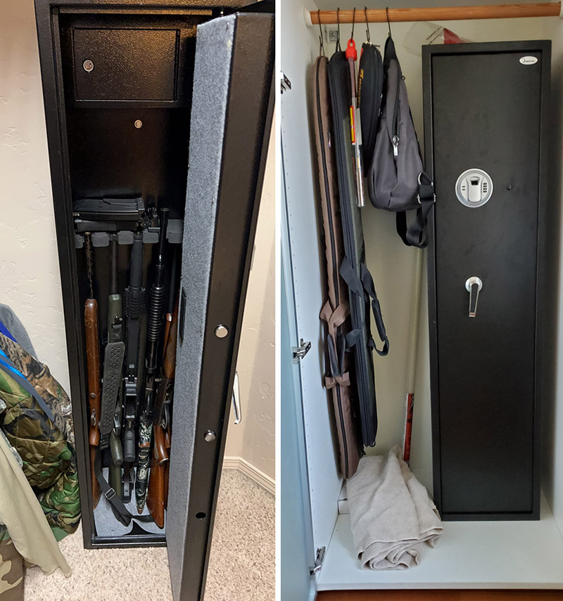 However, larger scoped rifles might need adjustments. It's not a heavy-duty safe or fireproof, but it fits my needs, keeping my firearms secure and away from my kids.