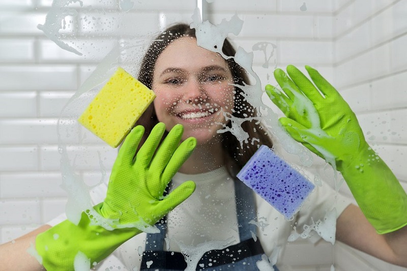 Smiling young girl cleaning glass shower with colorful gloves and sponges