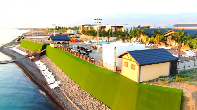 It offers single-story and two-story buildings with rooms featuring terraces, TV, and private bathrooms. The property provides breakfast and has its own pebbly beach. Facilities include a 24-hour front desk, secure parking, a children's playground, a 10x25 meter pool, a football-volleyball field, first aid services, a summer café, a children’s trampoline, well-maintained lawns, and flower beds. The resort offers European, Eastern, and Georgian cuisine, with a menu including sushi, kebabs, and cocktails. Water activities include boat rentals, jet skis, banana boats, water scooters, and catamarans.