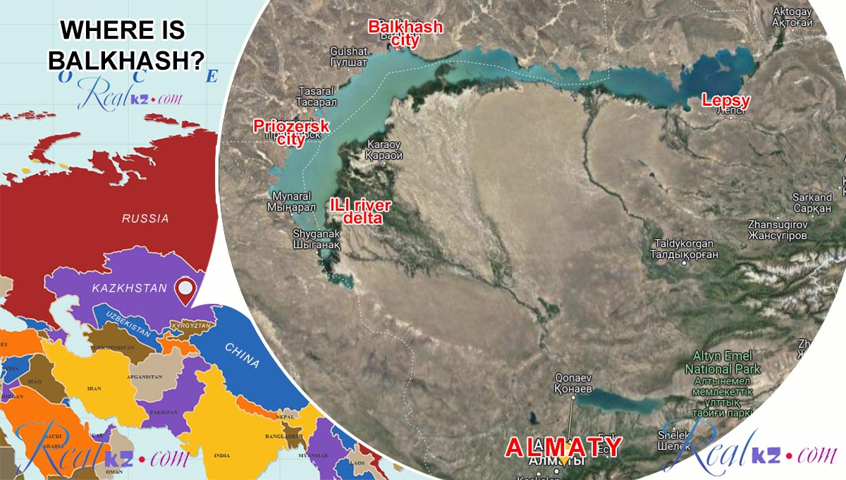 - Lake Balkhash is situated near the town of Balkhash, with some smaller settlements along its shores.