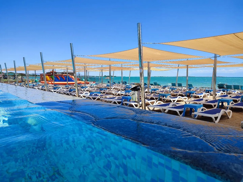 The package includes access to beach umbrellas, sun loungers, recliners, pools, shaded areas, a children's zone, a volleyball court, and table tennis. A café on the beach offers meals and drinks at affordable prices. The beach is equipped with walkways for easy movement, showers with city water, and changing cabins. There’s also a ramp for watercraft access. Guests with cars can use a covered, secured parking lot. In the evenings, movies are shown, and free Wi-Fi is available throughout the resort.