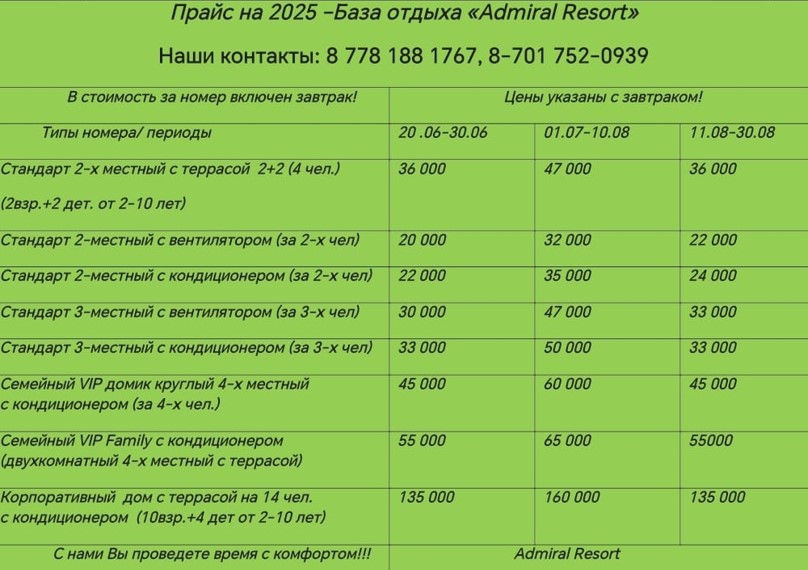 Это просто ужас! Администратор она же хозяйка очень грубая и мелочная. От того и сервиса нет никакого. Нам попался оказывается ещё хороший номер. У нас был кондиционер и телевизор нет нет работал. В душевой все время ужасный запах стоял. Туалетную бумагу выдают один рулончик на все время проживания. Сушилок нет. Вместо них привязали веревку к перилам?. Питание очень плохое. На завтрак каша и хлеб, причём совсем не вкусная. Порции маленькие. С собой со столовой даже хлеб нельзя с собой взять. Заказать дополнительно ничего не возможно. Можно только заказное блюда заранее заказать. Но порция мант стоит 3000 тенге за пять штучек!!! На обед суп без мяса и второе. Был один день на завтрак каша из сечки на обед суп из сечки и на ужин пюре с котлетой из сечки?. Столовая не рассчитана на такое количество постояльцев. Официанты не успевают даже еду разносить по столам. Не говоря уже чтобы убрать со стола. На все замечания администратор никак не реагирует. Каждый день с ней кто-то ругался. Пляж оборудован ??? челябинскими шезлонгами и такими же тапчанами если их можно так назвать. Это металлические коробки с синим тентом (как на барахолке в начале 2000х) вместо крыше. На пляж приезжают все кому угодно. Особенно в выходные. Соответсвенно в понедельник пляж выглядит как свалка. Я не видел чтобы кто-то из сотрудников Адмирала там убирался. Кстати про коронавирус администрация не слышала. У них даже градусника нет. И книги жалоб и предложений тоже нет.