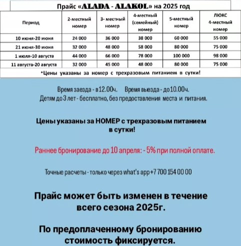 Добрый день всем читающим отзывы! Мы еще весной наметили отдых на Алаколе со стороны Семея, по отзывам выбор пал на "Алада Алаколь" , по ватсапу забронировали на июль 2024 года, директор Ришат сделал скидку 5%, таксисты на вокзале Жаланашколь довезли до места назначения (ехать примерно 40-50 мин). Нам все там понравилось - территория дома отдыха озеленена, вечером дискотека, музыка, бассейн чистый, кормили три раза - еда вкусная (каши, яичница на выбор по утрам, в обед первое/второе с салатиком. вечером второе, выпечка). Недалеко от дома отдыха есть магазинчики и кафешки. До озера минут 10, если идти пешком общий пляж, но там народу много очень. Нас с дома отдыха отвозил и привозил их собственный минивен до частного пляжа (минут 10), там народу меньше и лучше. Нам повезло погода была жаркая (больще 35 С) все время проводили на озере Алаколь, ездили только на обед, вечером можно пешком сходить в центр. Отдых был отличный, на ресепшене девушка все вопросы сразу решит если что то нужно. Рекомендуем!