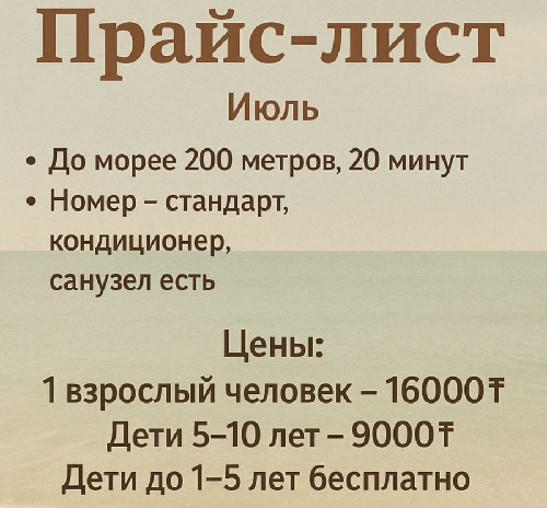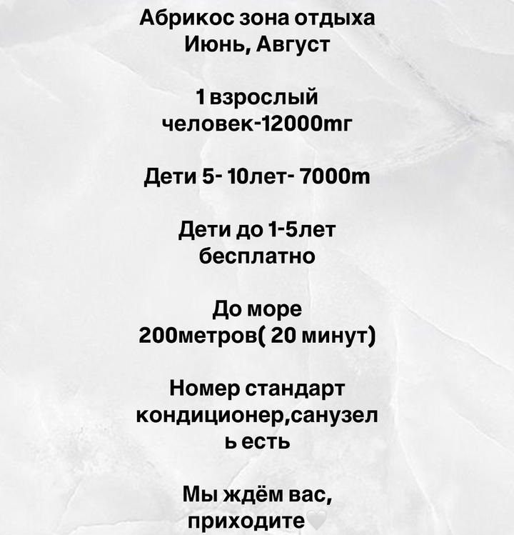 Были недавно на Абрикосе ....сказать что понравилось значить соврать ...начнем с питания .Питание утром каша манная пересоленая не смогли покушать ,повар (она ж хозяйка)сварила овсяный молочный супчик но и он получился неразваренный ....молоко к чаю дают мало ,а если просишь то лица недовольные .Потом заметили на их столе баурсаки для обслуживающего персонала и возник вопрос а почему для отдыхающих нет ?попрлсили туалетную бумагу технтчка говлрит :тамже была от предыдущих .То есть потиратся от тех кто был донас .Попросили сделать коктал сдедади из несвежей замороженной рыбы был вкус прогорклый. А ведь за одного берут15000 неужели жалко дать бумагу ,молока достаточно для чая итд .Ведь все таки благодаря клиентам они существуют и зарабатывают .Стыдно очень за наш такой сервис.......Вам бы поучится за за границей ....Вроде все это мелочи но как неприятно .В душе лейка сдомана и в ней тож вода набирается не стекает куда нужнл.Да и територия грязная пыльная можно ж хотя бы полить смыть водой грязь ...детская площадка качели сломаны ....все что тут делается временно видно что лишь бы деньги сделать остальное не важно .....Поэтому если хотите зарабатывать то учитесь работать ради клиентов ради достойного будущего и отдыха