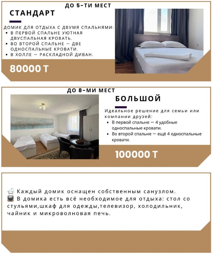 В домиках предусмотрены: 1.Телевизор 2.Электрический чайник 3.Холодильник 4.Микроволновка 5.Сан узел 6.Душ