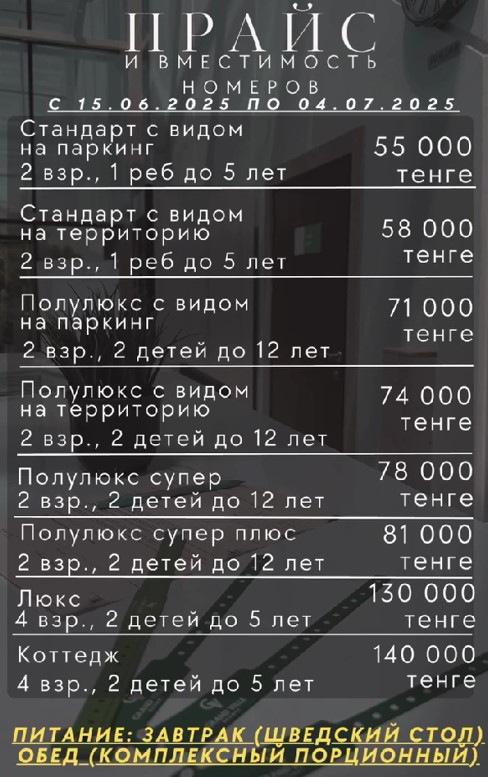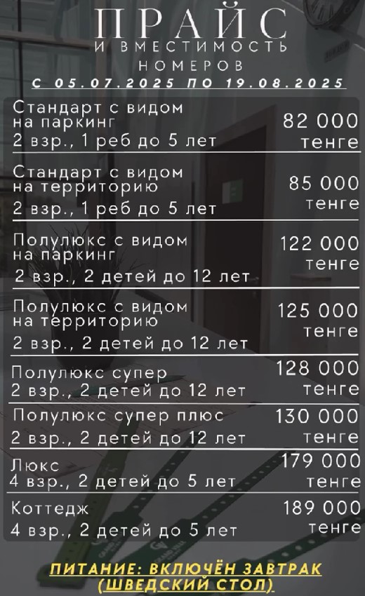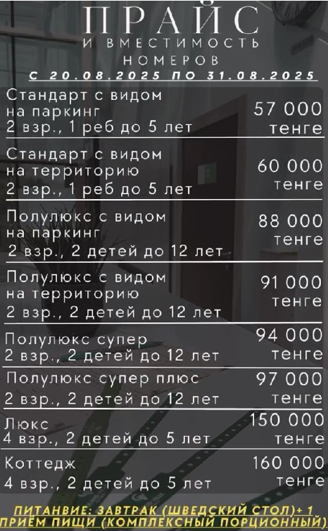 P.S Двадцать шестого июля в отеле был неплохой концерт, со звездами эстрады, огненным шоу и в завершении всего красивый салют, все понравилось но организации опять никакой со стороны администрации. За каждое посадочное место нужно было заплатить 5000тг, не хочешь платить места для тебя нет за столиком, эти деньги потом пошли в качестве оплаты за питание. Тоже позор, получается хочешь ты или нет бери опять же их манты с пловом и жуй чтобы 5000 не пропали. Мы тоже оплатили 20000тг, сами положили записку под стекло, что именно этот столик наш, и пошли переодеваться. Когда пришли все столики были заняты. Поставили нам какой то другой столик в другом месте, полный бардак, организации ни какой.