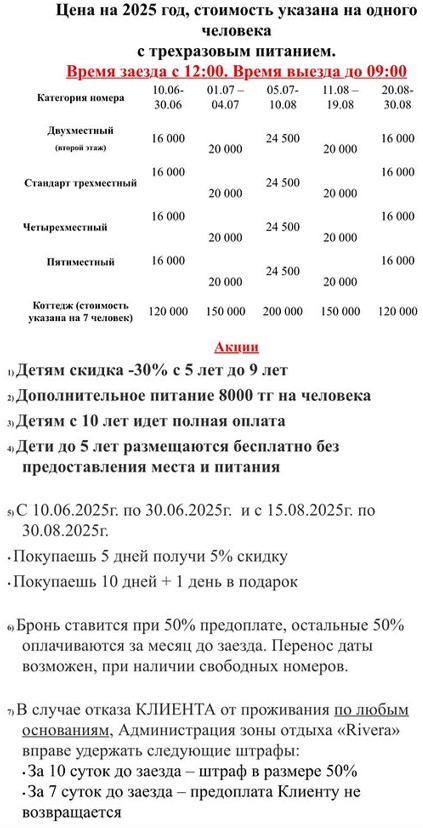 Долго выбирали базу отдыха, но мест на эту дату не было или без питания. Зашли на вкладку Ривьера и нам сразу понравился вид и то, что первая береговая линия, идти до пляжа не нужно, просто спустись по лестнице и вот тебе галечный пляж. Сделали предоплату всего 30 000тенге на 16.08.2022 до 20.08.2022, также оплатили трансфер в аквариде тур, но там нгам сказали, что привозят только до зоны отдыха Комфорт. Оказалось, что идти от Комфорта по дороге небольшой всего 100 метров. Да бпривезли нас утром, всё было закрыто. Я спустилась к пляжу и уже из него поднялась по лестнице в Ривьеру. Кухня была открыта и там девушки сказали, мне, что администрация придет к 8.00 (мы приехали в 6.40 утра). Они сами позвонили, пришла администратор, оформила меня и подругу, доплатили ей еще 80000тенге.и дали номер на 3х(хотя оплачено было за 2хместный номер) на 1 этаже. (Всего стоймость проживания на 2х человек обошлась в 110000тенге) Номер был просторный, с холодильником, телевизором, кондиционером, туалет, душевая, раковина. Большое окно, рядом с номером на улице стояла сушилка для белья, которую можно было складывать и заносить на ночь в номер. И это около каждого номера. Сразу дали чистое бельё на 2х (2простыни, 2пододеяльника, 2наволочки) + 3 полотенца(т.к. номер 3хместный) В душевой висело еще одно полотенце для ног. Также дали туалетную бумагу. В номере не было мыла, но мы взяли с собой. В целом все было нормально. Завтрак начался в 8.30 до 10.00 (каша пшеничная, сливочное масло, хлеб, сахар) чай и молоко можно было наливать в неограниченном количестве. Рядом стоял также бойлер с горячей водой. Обед состоял из 3х блюд (Борщ, котлеты с макаронами, компот, свежевыпеченный хлеб, варенье) Ужин (Гарнир гречка, мясо обжаренное) булочка, хлеб свежеиспеченный. Меню каждый день менялось. Также давали арбузы (очень сладкие), яблоки. Порции для меня были нормальные, но некоторые мужчины говорили, что мало. Пляж чистый, его убирали каждый день. Сначала меня напрягло, что за шезлонги нужно платить, но оказалось, что на гальке лежать приятно, прогрев всего тела, так как галька нагревается сильно. Море теплое и нужно ходить плавать утром, пока нет волн. Один день были волны и люди всё равно плавали и им это нравилось, наверное представляли себя, где-нибудь в Мексиканском заливе, Канкун или Гвадалахара с Акапулько. Всё было нормально, пока не высадился контингент из России. Приехало сразу около 25 человек, потом еще. Постоянные пьянки, попойки и крики по ночам. Устраивают стриптиз на дискотеке вечерней, с раздеванием и желанием поплавать в прибой по ночному Алаколю с криками и матами. Вообщем всё нормально! Мне понравился отдых в базе отдыха Алаколь. Некоторые люди говорили, что в номере паутина и еще что-то. Так а зачем вы по ночам включаете свет, на который летят ночные бабочки и еще что-нибудь? У нас в номере были и мухи, но с ними можно как-то бороться, была и паутина, на которую я не обращала внимание. Ведь приехали мы всего на 5 суток и требовать от людей королевских условий - это глупо! Кормили нормально, номер был просторный, с чистым бельём, вода в душе была горячая, туалет чистый, один раз в номере убирали. Самое главное, что я приехала на озеро Алаколь отдыхать и наслаждаться этим воздухом, водой, солнцем, а не ругаться. Всем здоровья и не ищите грязи, где её нет!