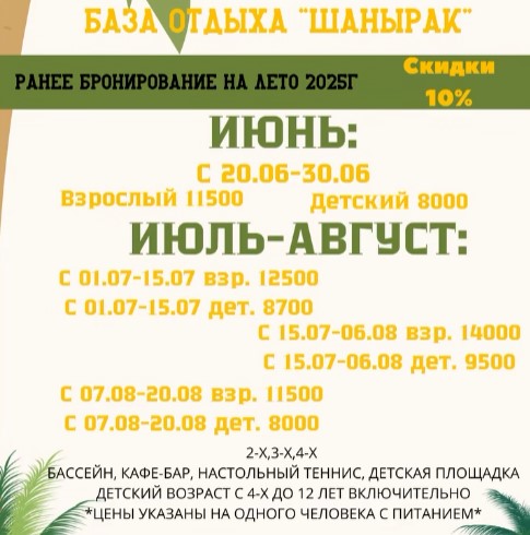 Зона отдыха Шанырак представляет вам удобные и комфортные номера, рассчитанные на проживание от 2 до 4 человек в комнате. Номер чистый и уютный, оснащены кондиционером, холодильником, необходимой мебелью и санузелом. В стоимость входит трёхразовое питание в летней террасе. На территории находиться летнее кафе с караоке, так же оборудована детской площадкой, беседками, настольными играми. Зона отдыха находится не далеко от Арбата где по вечерам проводятся концерты и развлечения.