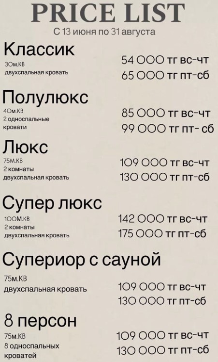 Отдыхали 6-7 июля 2017 года, цены "дерут" как за элитный отель, а сервис оставляет желать лучшего, во-первых путь к базе отдыха лежит через бездорожье, пыльная дорога, проложенная отдыхающими, стоянка для машин отсутствует, машину ставишь тут же перед входом в хаотичном порядке, хотя бы крытую стоянку сделали, приехали мы в 18.00, девушка которая нас оформляла, сказала что выезд будет так же в 18.00 следующего дня, но нас выселили в 14.00 на следующий день, при этом сказав что мы должны были выехать еще в 12 дня, сервис в кафе тоже оставляет желать лучшего...сделали заказ, при расчете официант принес нам чек, включив в него сигареты, которые мы не заказывали, на следующий день решили пообедать, окрошку ждали час, уже собирались уходить, нам принесли заказ...пляж очень маленький, купаться в воде невозможно, при входе в воду много острых камней, а если поплавать, то за ноги сразу же цепляются то ли водоросли, то ли камыши...бассейн сильно хлорирован...уезжали мы потратив много денег (за номер 45 000тенге + еда примерно 30 000) естественно с отрицательными эмоциями, нам девушка на ресепшене ни до свидания, ничего не сказала...вот такой у нас получился "отдых"