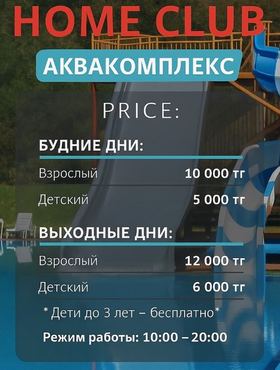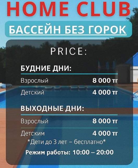 2х, 3х, 4х местные номера. «Home Club» - семейно-развлекательный комплекс, расположенный в уникальном экологически чистом и необыкновенно живописном природном уголке предгорья Заилийского Алатау. Гармоничное сочетание современной инфраструктуры и девственной природы - изюминка «Home Club». Элитный загородный коттеджный комплекс оснащен всем необходимым для комфортного отдыха и досуга в течение всего года: огороженная охраняемая территория с асфальтированными дорожками и проездами, детская игровая площадка, фонтаны, бассейн и озеро. Здания, выстроенные в стиле «шале», придают комплексу дополнительный колорит и изысканность.