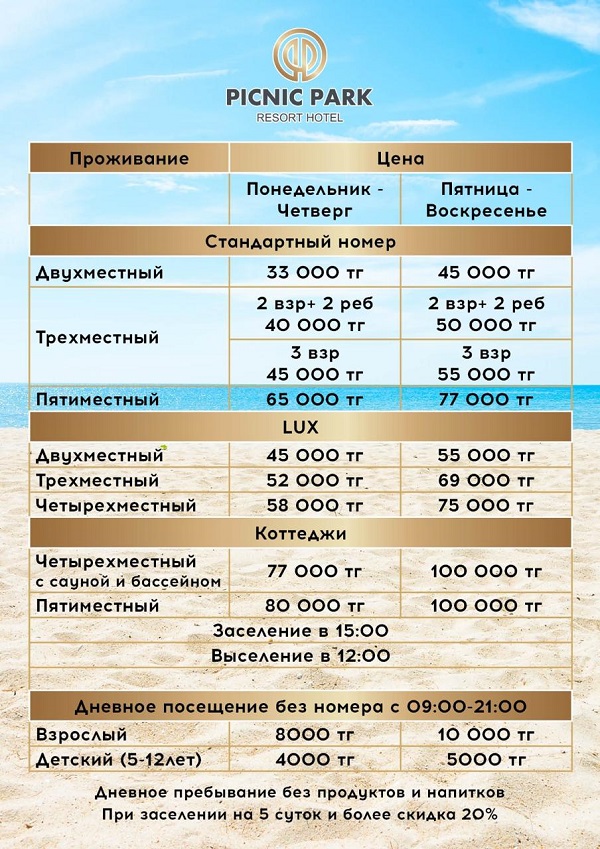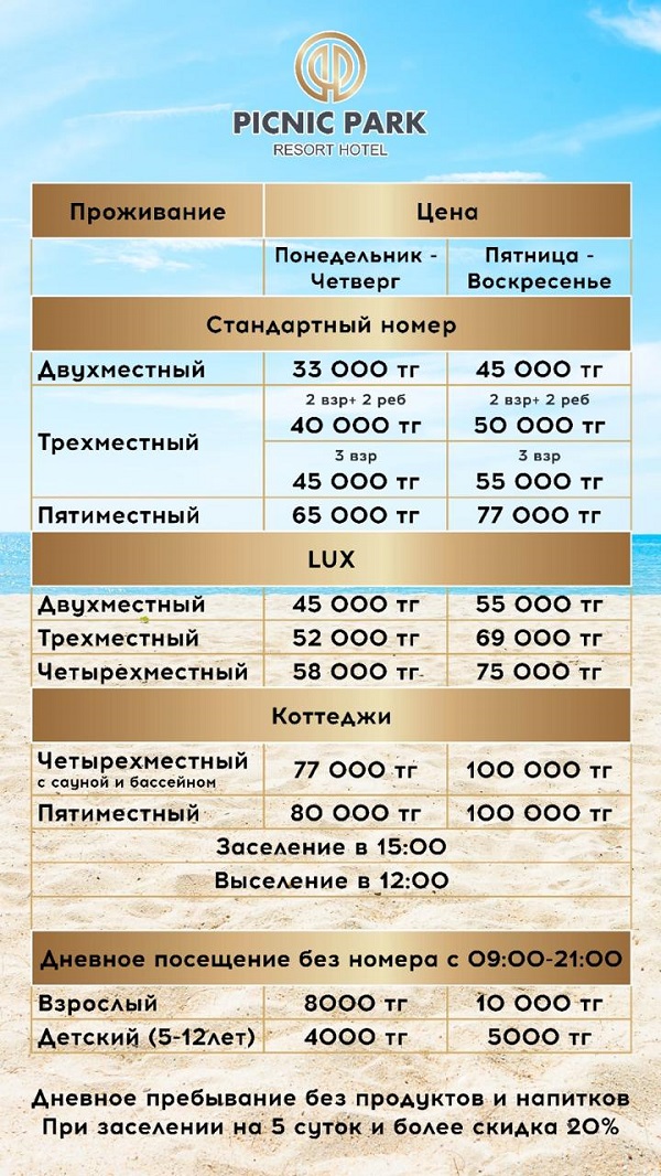 Добрый день, Пикник Парк,огромное спасибо за прекрасный отдых.Атмосфера очень хорошая, отзывчивый персонал. Музыка до часу ночи, можно конечно подольше продлить, купаться можно до 9ти вечера, говорят, что это из-за очищения бассейна. мангалы и холодильники входит в сумму номера.