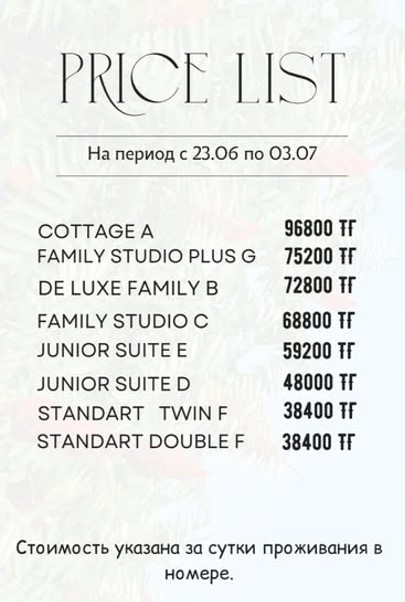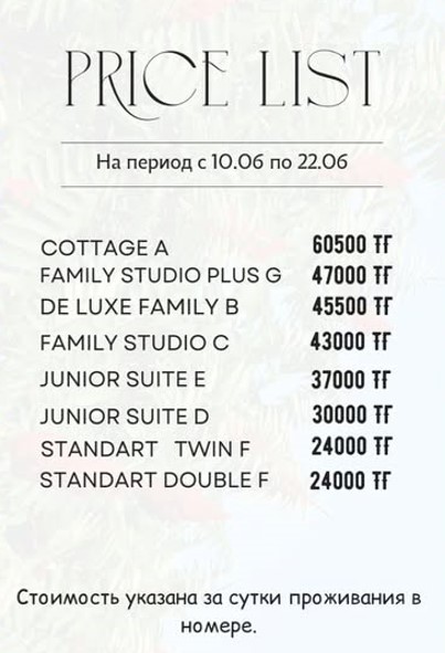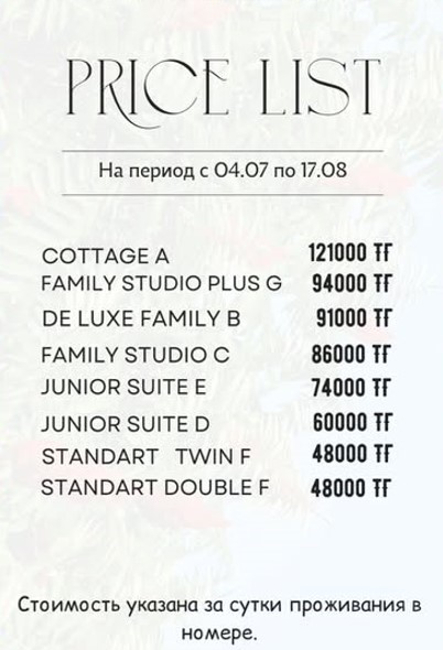 Разочарованы!!! Матрасы продавленные,самые дешевые,спать не удобно,в номере постель так и не поменяли,уборка посредственная, кондеры еле еле охлаждают,заставили подписывать на рецепшене какой то пункт о разглашении личной информации,при отказе подписания сказали заселять и оформлять номер не будут-чистый шантаж!!!, WIFI в номере не работает,комары на территории постоянно,хотя говорили, что территория обрабатывается от комаров-ничего подобного,на веранде невозможно сидеть вечером. И за это все 400 000тг??? и без питания??? Питание-отдельная история: Супы пересоленые и очень жирные,ребенок отказался есть,каши-водянистые безвкусные-ребенок отказался есть!!! Вторые блюда-очень жирные,некоторые пересоленые!!! Цены непомерно высокие относительно качества пищи!!! Одни компоты выходили на 800-100тг за один только обед-они что у вас золотые? на 4 человека обед обходился 7-9тыс. Цены на блюда выше на 30-50% чем на соседних зонах на одни и те же блюда или пирожные,или вы про это не знаете,думаю прекрасно знаете? В общем к вам больше ни ногой. Надеюсь наш отзыв поможет вам улучшить качество ваших сервисов!!!