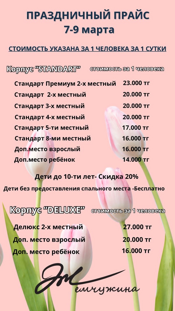 Уютные 2х, 3х, 4х, 5, 8 местные номера. «Жемчужина» - новая база отдыха, на территории которой есть собственная скважина с минеральной водой. Она насыщена множеством полезных компонентов (кальций, натрий, кремниевая кислота и др.), которые помогают избавиться от гипертонии, ревматизма, полиартрита, стенокардии и других заболеваний.