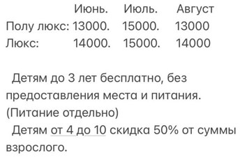 Берег рядом, метров 100 до пляжа, вайфай, вкусно кормят в обед, но хлеба ложат мало, стандартные номера с санузлом и душем, цены на июль 16000 с человека, но мы бронировали по июньским ценам 13000, отдых хорош,но был ветер сильный и электроэнергия пропадала. В целом , регион нужно улучшать, тут в округе нет аптеки, от аптеки только название на карте. Цены в магазинах в полтора раза выше, чем в среднем алматинском супермаркете. Понять можно такие цены, так как магазины работают сезонно,три месяца в году, остальное время туристов тут мало.