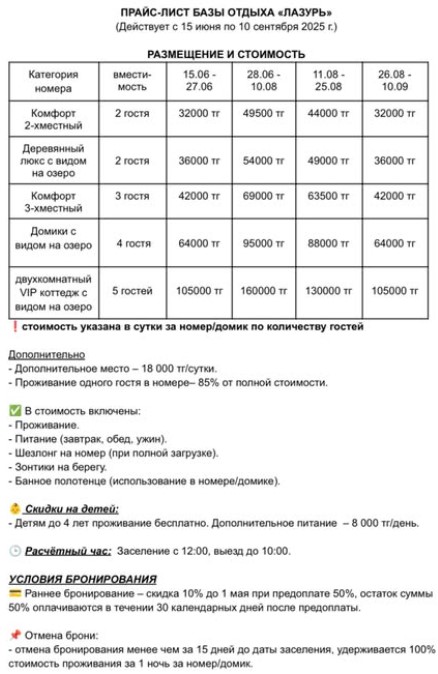 Прайс-лист сезона 2025 года