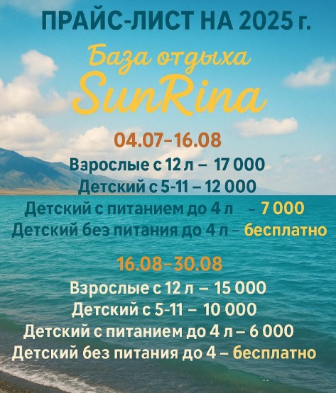 С 18.08.-22.08.2023 отдыхала с семьей и очень довольна! Кормят отлично 3х разовое питание. Персонал доброжелательный, атмосфера семейная, уехали в хорошем расположении духа, набрались позитивной энергии и полетели домой в Астану. Рахмет Ринату, Сауле, шеф-поваруЖумагуль 💐🌞все очень-очень вкусно😋😋😋, рекомендую всем ,не пожалеете!!! Удачи в вашем бизнесе, вы молодцы🙌🥰🎉