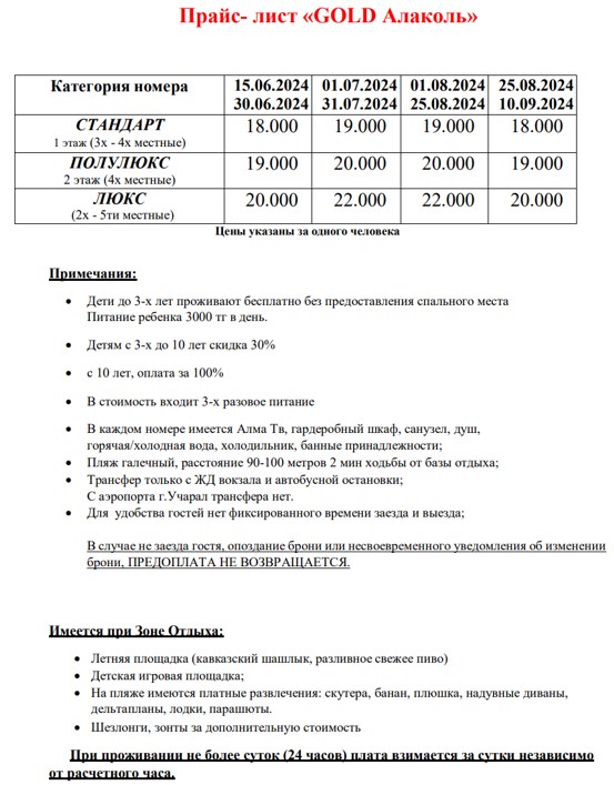Прайс-лист сезона 2024 года