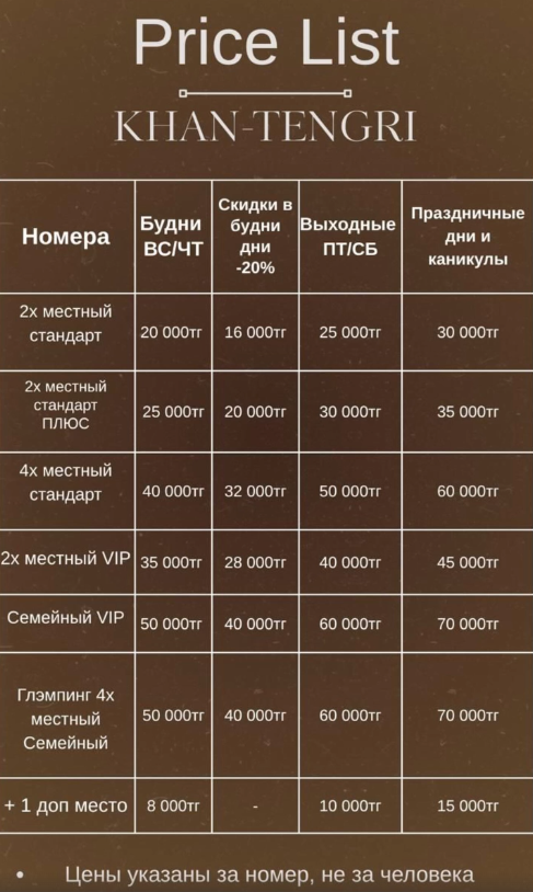 Отдыхали с друзьями на базе отдыха Хан Тегри с 10 по 12 ноября, все очень понравилось. Номера чистые ,. уютные, есть вайфай, бассейн находится в шаге от номеров что не дает посетителю время замерзнуть, а это очень важно в зимний период времени. На базе отдыха не многолюдно, хотя все номера были распроданы, что тоже нас порадовало не было толпы в бассейне. Вода очень комфортная для купания,. бассейн чистый. В номере есть халаты и банные полотенца. Единственно в нашем номере не работал пульт от телевизора. Но нам он и не нужен был. Единодушно с друзьями решили отдыхать только на этой базе отдыха.