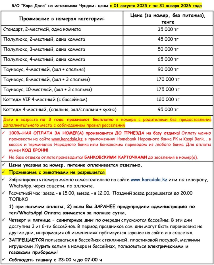 Детский 500 тг Уютные 2х, 3х, 4х, 8, 10 местные номера. Бассейны Карадала с целебной водой из собственной скважины глубиной 650 метров: 4 бассейна под открытым небом, включая детский бассейн и бассейн-джакузи под навесом, и 2 закрытых бассейна - детский и взрослый. Температура воды в бассейнах в среднем 37-39 °С круглый год. Состав воды идентичен минеральной воде Сары-Агаш. До Чарынского каньона около 100 км. Размер открытых бассейнов 21х11 метров! Мобильный интернет Tele2 работает отлично.