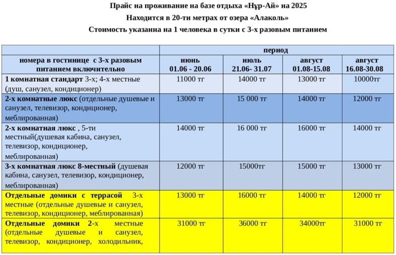 Внимательный и дружелюбный персонал создаст для Вас все необходимые условия для уютного и комфортабельного отдыха!Наша база отдыха на берегу озера Алаколь способна разместить до 100 человек, что исключает суету, шум и неудобства, связанные с большим потоком людей. Приглашаем Вас провести семейный отдых на Алаколе!Сотрудники базы отдыха «НУР-АЙ» на озере Алаколь организуют Вашу встречу с автобусов и поездов, а также организуют проводы до транспорта.