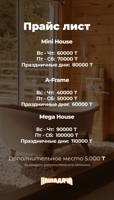 Комплекс здорового отдыха и хорошего настроения! Домик A-Frame вместимость до 4х человек (Матрац на втором этаже и раскладной диван на первом этаже) Дом выполнен в стиле Лофт-Модерн, необычная форма дома, 2 этажа, сан узел в неординарным стиле с тропическим душем. Mega House Дом в стиле Хайтек, максимальная вместимость 6 человек (2 спальни с двуспальными кроватями и раскладной диван в гостиной на первом этаже) Mini House Вместимость 2 гостя. Первый этаж дома в стиле фьюжн, Ванна у панорамного окна с видом на реку и горы, отделка дома внутри из натуральной древесины, теплые полы, на втором этаже спальня в стиле Прованс выполненная в красивых спокойных тонах.