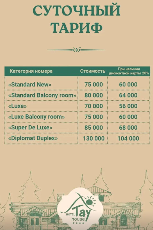 сертификату "Шале" составляет: 15 000 тг в номере "Standart", 20 000