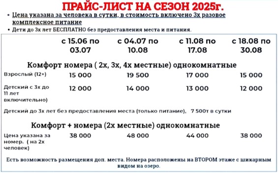 Были там на отдыхе и хотим выразить благодарность за замечательную базу отдыха - номер просторный, озеро видно с окошка номера, все блага цивилизации в наличии, питание сытное -утром каша, выпечка, печенье и конфеты, на обед всегда первое и второе, на ужин второе и салат - все наедались от пуза о, пляж одна минута хотьбы - и до завтрака ходили купаться. Хозяин и все, кто работает- внимательные, радушные,^. Приехали позже завтрака - для нас приготовили завтрак, выезжали полчетвертого- в дорогу собрали для нас ужин - курочку пожарили, яйца отварили, помидорки с огурцами, лепешки.