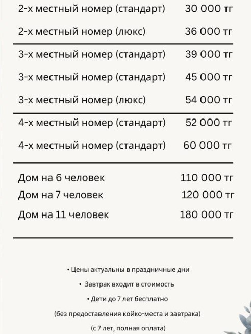 Оплату мы принимаем только наличными. Позаботьтесь об этом заранее, собираясь к нам на отдых. Исключением является предоплата, в этом случае вы можете перевести нам деньги через KASPI