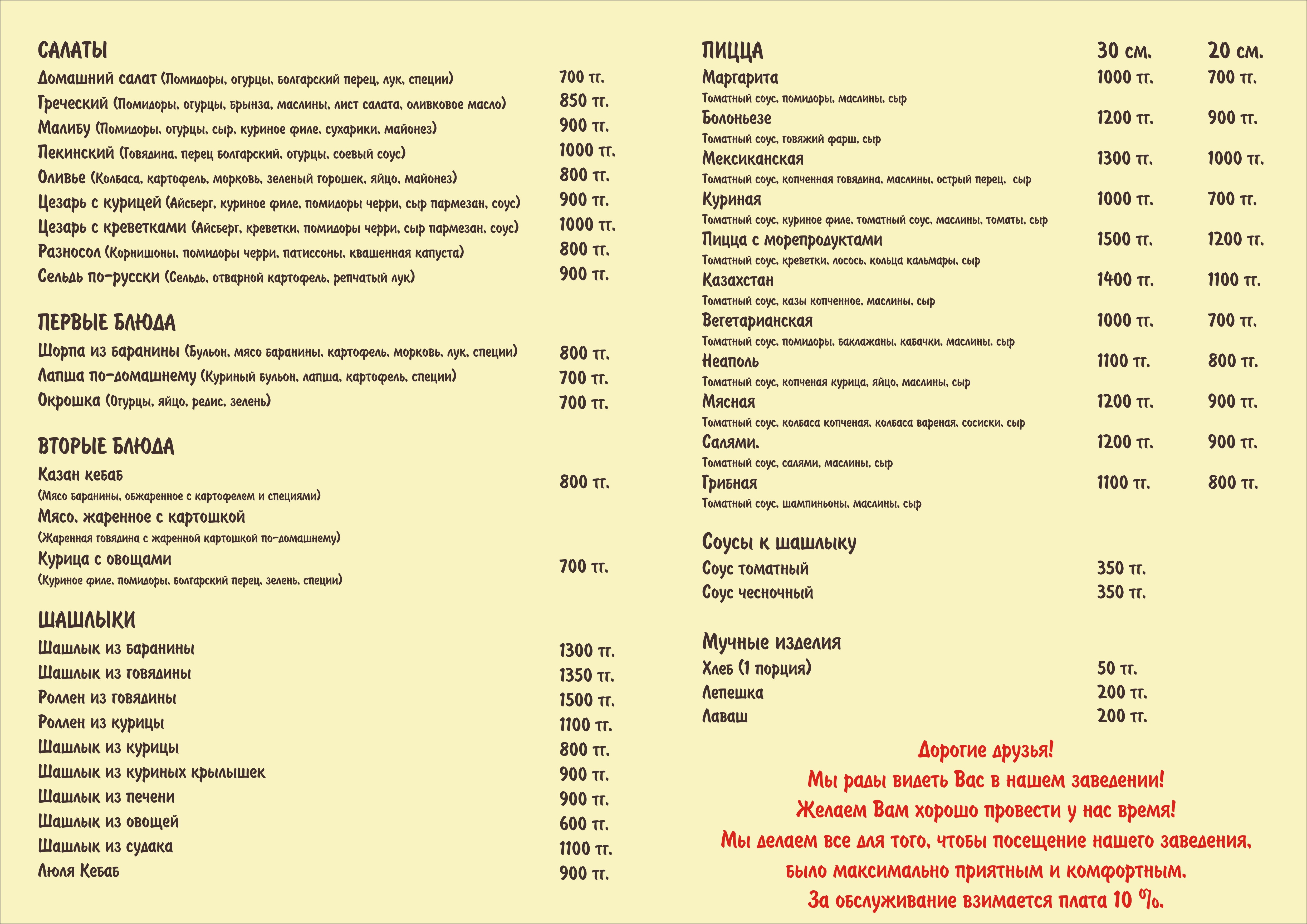 Standard double rooms - Day – 15,000 tenge, Half a day – 10,000 tenge