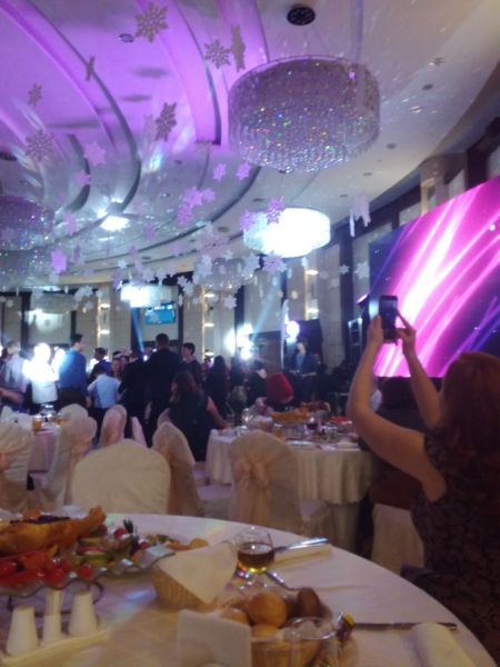 Отмечали Новогодний корпоратив в этом ресторане в воскресенье. Очень пафосное место, красивый зал, мы были в сиреневом зале. Красиво урашенные столы, вкусная еда. Первое горячее было мясо с овощами, а второе горячее большой кусок красной рыбы. Официанты классные очень предупредительные и вежливые. Слегка омрачил наш праздник один момент, пока наши некоторые коллеги танцевали и участвовали в конкурсах их второе горячее исчезло.