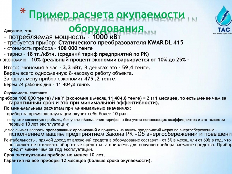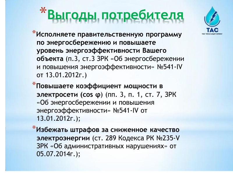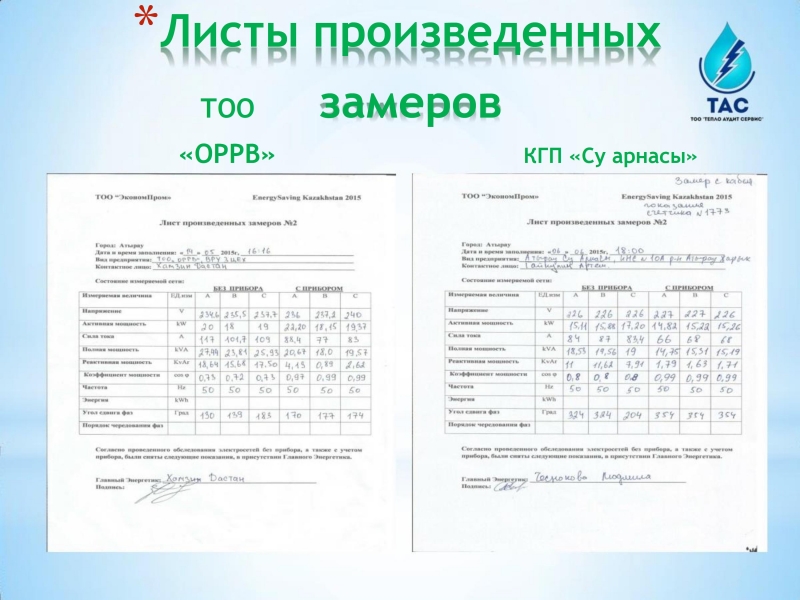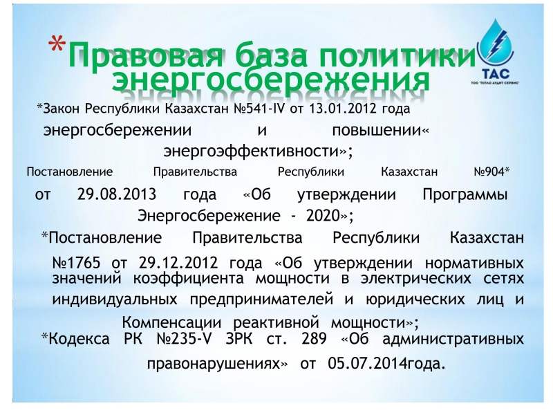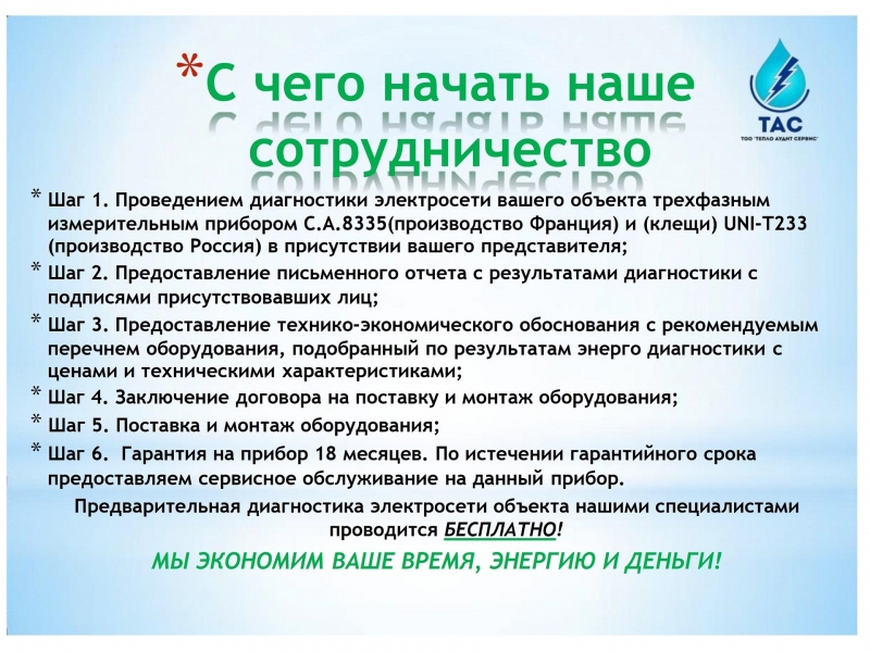 В рамках исполнения Закона Республики Казахстан от 13 января 2012 года № 541-IV «Об энергосбережении и повышении энергоэффективности» и Приказа Министра по инвестициям и развитию Республики Казахстан от 31 марта 2015 года № 393 «Об утверждении нормативных значений коэффициента мощности в электрических сетях индивидуальных предпринимателей и юридических лиц». Предлагаем Вам специализированные услуги по измерению электрических параметров, качество электросети и электроэнергии на объектах.