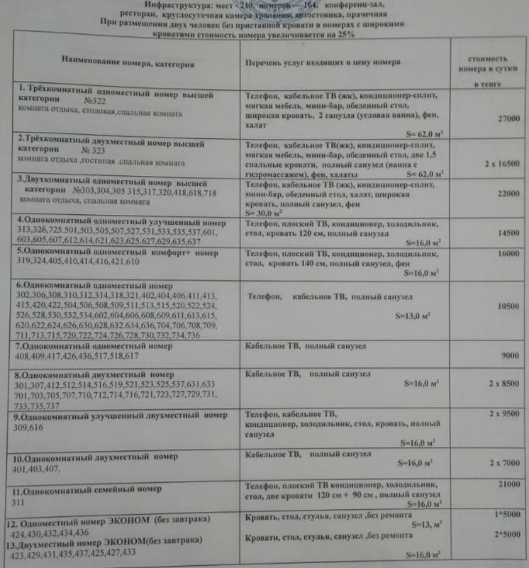 У нас есть 1, 2 местные номера. Гостиница Усть-Каменогорск расположена в непосредственной близости от административного центра города, имеет удобные подъездные пути, благоустроенную и освещаемую прилегающую территорию, площадку с твердым покрытием для кратковременной парковки и маневрирования автотранспорта, а так же автостоянку. Для проживающих в гостинице гостей обеспечены безопасность жизни и здоровья, сохранность их имущества.